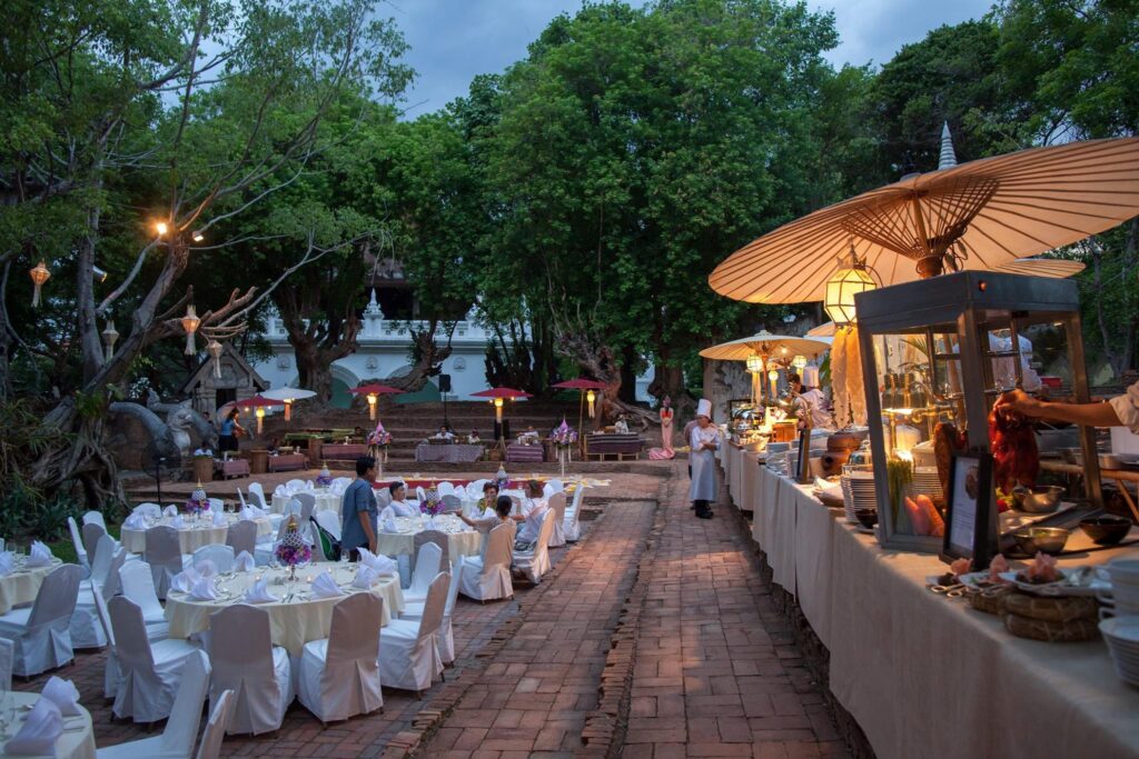 A unique brick amphitheater, surrounded by a moat and towering trees, provides an enchanting venue for enjoyable private outdoor music and dance performances. Additional decorations such as hanging lanterns will surely enhance the night.